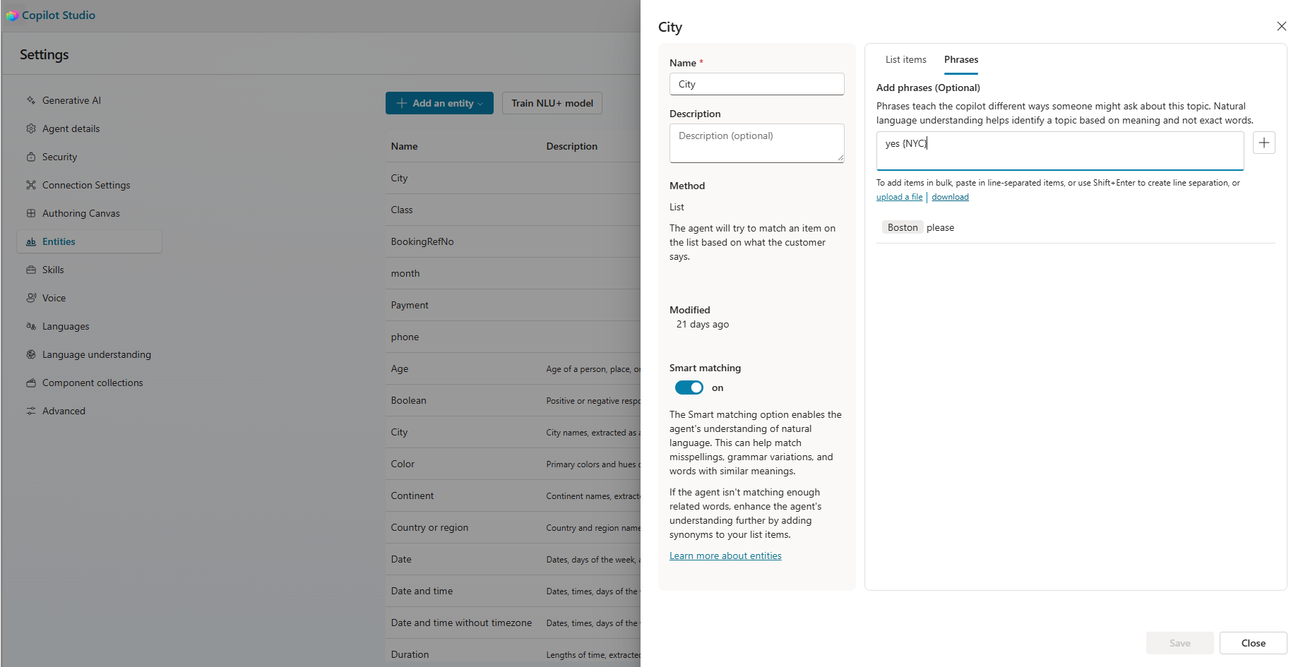 {ENTITY_NAME/Entity item or synonym}: Hvis det er nødvendigt, kan du angive enhedsnavnet, som er navnet på den lukkede liste eller RegEx. Hvis du angiver enhedsnavnet, bliver det nemmere at læse i YAML, og det svarer også til den syntaks, der bruges i emner.