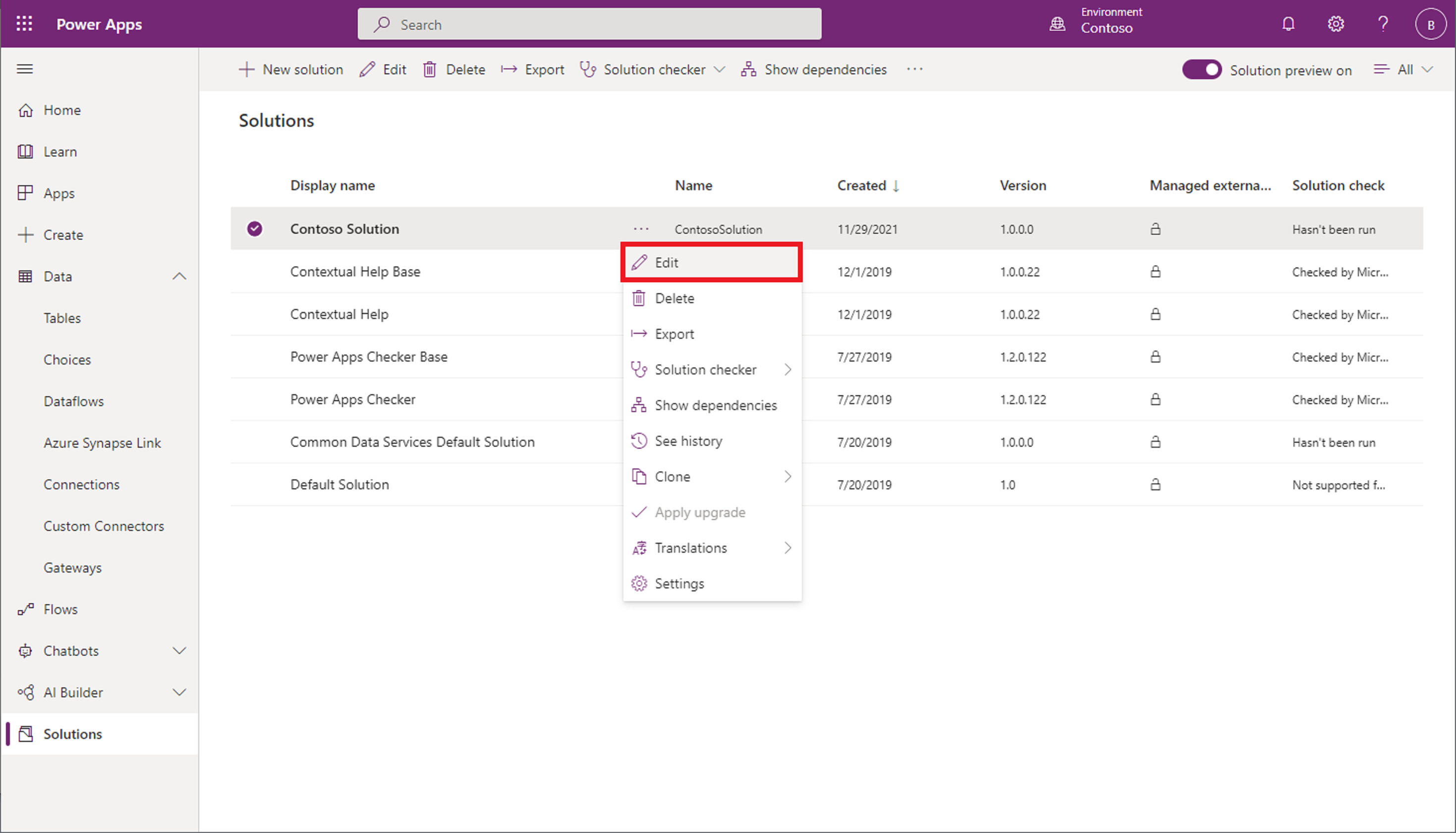 Vælg den løsning, du vil føje et nyt dataflow til, og vælg Redigeri genvejsmenuen.