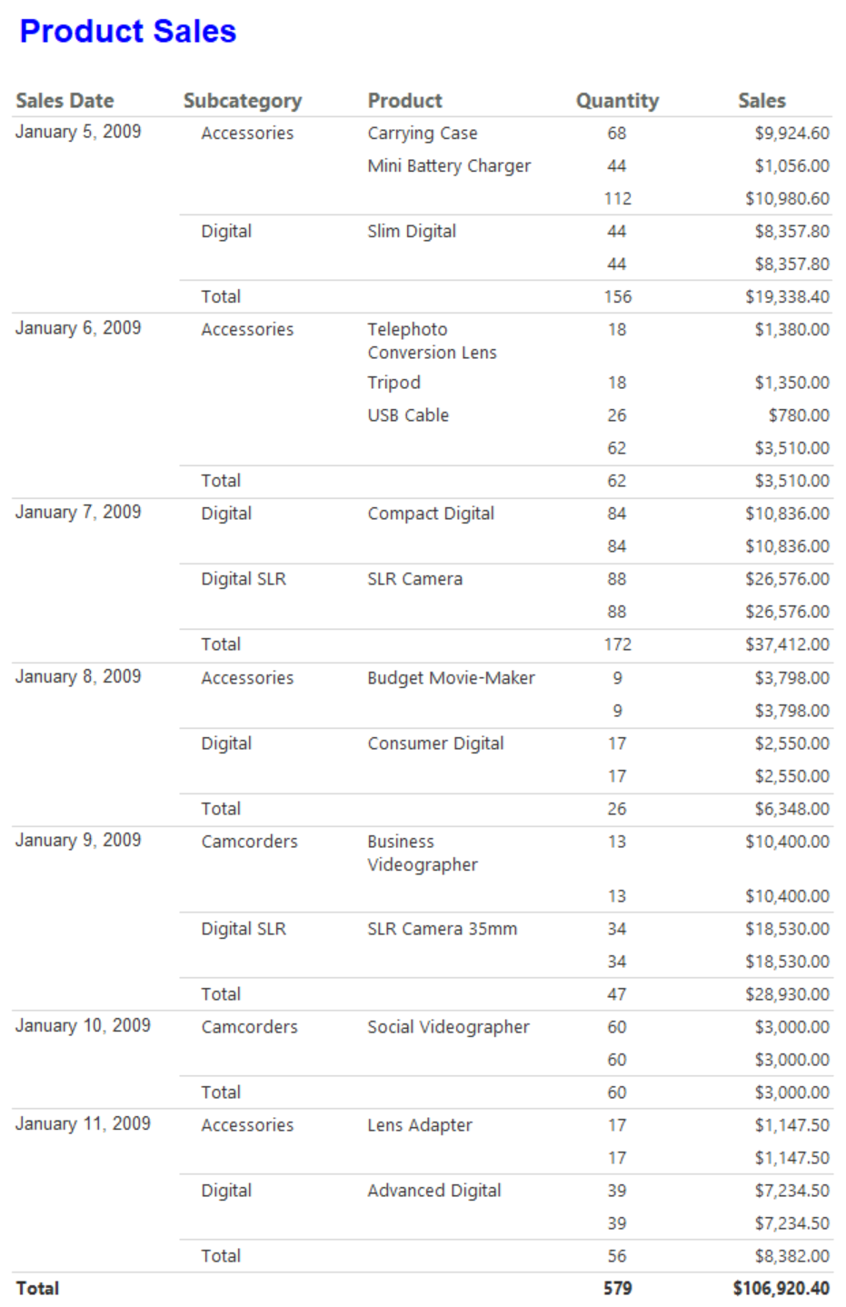 SELECT CAST('2009-01-05' AS date) as SalesDate, 'Accessories' as Subcategory, 'Carrying Case' as Product, CAST(9924.60 AS money) AS Sales, 68 as Quantity UNION SELECT CAST('2009-01-06' AS date) as SalesDate, 'Accessories' as Subcategory, 'Tripod' as Product, CAST(1350.00 AS money) AS Sales, 18 as Quantity UNION SELECT CAST('2009-01-11' AS date) as SalesDate, 'Accessories' as Subcategory, 'Lens Adapter' as Product, CAST(1147.50 AS money) AS Sales, 17 as Quantity UNION SELECT CAST('2009-01-05' AS date) as SalesDate, 'Accessories' as Subcategory, 'Mini Battery Charger' as Product, CAST(1056.00 AS money) AS Sales, 44 as Quantity UNION SELECT CAST('2009-01-06' AS date) as SalesDate, 'Accessories' as Subcategory, 'Telephoto Conversion Lens' as Product, CAST(1380.00 AS money) AS Sales, 18 as Quantity UNION SELECT CAST('2009-01-06' AS date) as SalesDate,'Accessories' as Subcategory, 'USB Cable' as Product, CAST(780.00 AS money) AS Sales, 26 as Quantity UNION SELECT CAST('2009-01-08' AS date) as SalesDate, 'Accessories' as Subcategory, 'Budget Movie-Maker' as Product, CAST(3798.00 AS money) AS Sales, 9 as Quantity UNION SELECT CAST('2009-01-09' AS date) as SalesDate, 'Camcorders' as Subcategory, 'Business Videographer' as Product, CAST(10400.00 AS money) AS Sales, 13 as Quantity UNION SELECT CAST('2009-01-10' AS date) as SalesDate, 'Camcorders' as Subcategory, 'Social Videographer' as Product, CAST(3000.00 AS money) AS Sales, 60 as Quantity UNION SELECT CAST('2009-01-11' AS date) as SalesDate, 'Digital' as Subcategory, 'Advanced Digital' as Product, CAST(7234.50 AS money) AS Sales, 39 as Quantity UNION SELECT CAST('2009-01-07' AS date) as SalesDate, 'Digital' as Subcategory, 'Compact Digital' as Product, CAST(10836.00 AS money) AS Sales, 84 as Quantity UNION SELECT CAST('2009-01-08' AS date) as SalesDate, 'Digital' as Subcategory, 'Consumer Digital' as Product, CAST(2550.00 AS money) AS Sales, 17 as Quantity UNION SELECT CAST('2009-01-05' AS date) as SalesDate, 'Digital' as Subcategory, 'Slim Digital' as Product, CAST(8357.80 AS money) AS Sales, 44 as Quantity UNION SELECT CAST('2009-01-09' AS date) as SalesDate, 'Digital SLR' as Subcategory, 'SLR Camera 35mm' as Product, CAST(18530.00 AS money) AS Sales, 34 as Quantity UNION SELECT CAST('2009-01-07' AS date) as SalesDate, 'Digital SLR' as Subcategory, 'SLR Camera' as Product, CAST(26576.00 AS money) AS Sales, 88 as QuantityOn the query designer toolbar, select Run (!):