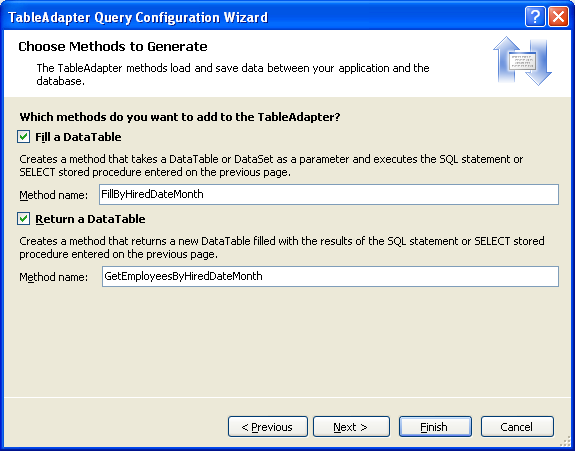 Wählen Sie aus, eine SQL-Anweisung hinzuzufügen, die Zeilen zurückgibt. Wenn Sie den Bildschirm "Angabe einer SELECT Anweisung" erreichen, wird die Standardanweisung SELECT für die EmployeesTableAdapter bereits geladen. Fügen Sie einfach die WHERE Klausel hinzu: WHERE DATEPART(m, HireDate) = @Month.