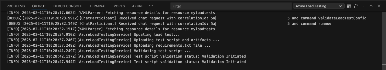 Copilot überprüft die Konfiguration vor der Ausführung. Folgen Sie den Anweisungen im Chatfenster. Andernfalls werden das Testskript und die zugehörigen Artefakte in Azure Load Testing hochgeladen und für die Ausführung vorbereitet. Dieser Vorgang kann bis zu einer Minute dauern, und der Fortschritt wird im Ausgabebereich angezeigt.