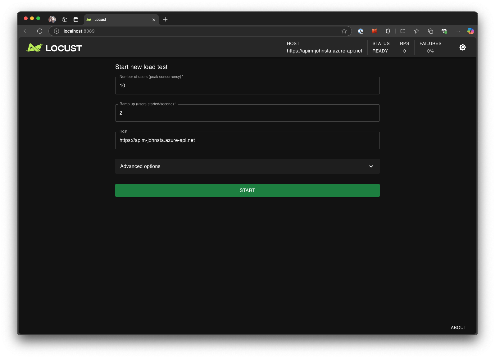 Die Locust-Web-UI wird automatisch in einem Browser gestartet. Es kann einige Sekunden dauern, bis der Locust-Server bereit ist und der Browser geöffnet wird.