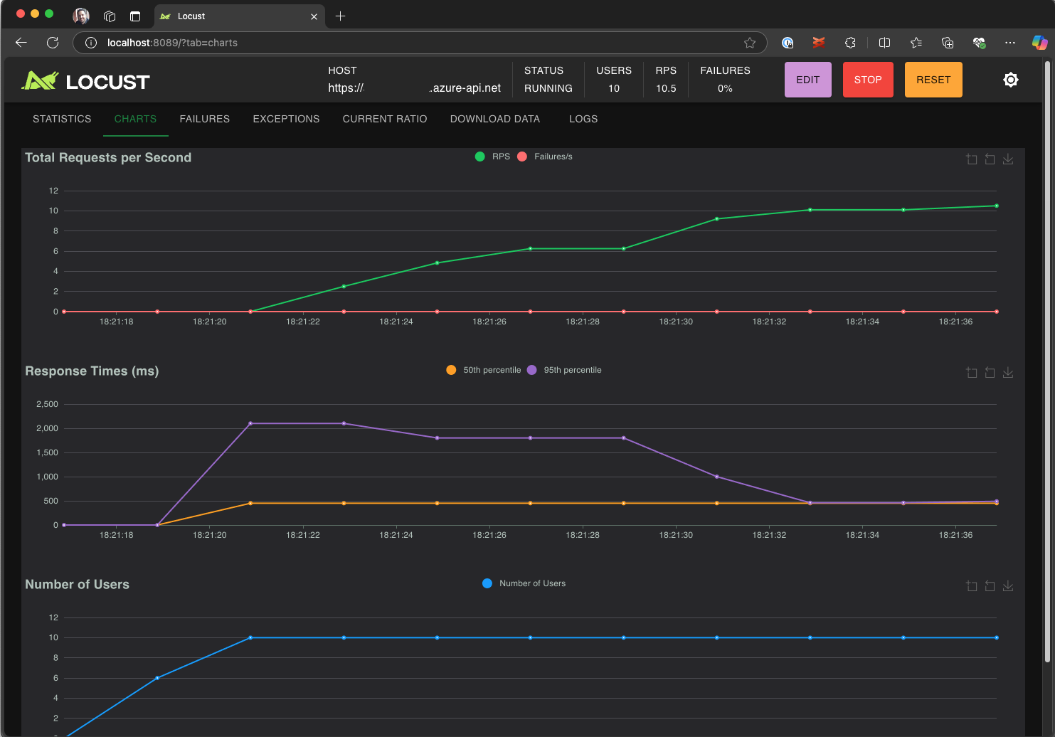 Erkunden Sie die Locust-Benutzeroberfläche , um Reaktionszeiten, Fehlerraten und Anforderungsdurchsatz zu analysieren.
