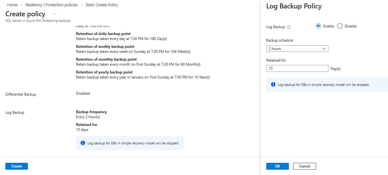 - Wählen Sie unter Richtlinie für differenzielle Sicherung die Option Aktivieren aus, um die Einstellungen für Häufigkeit und Beibehaltung vorzunehmen.