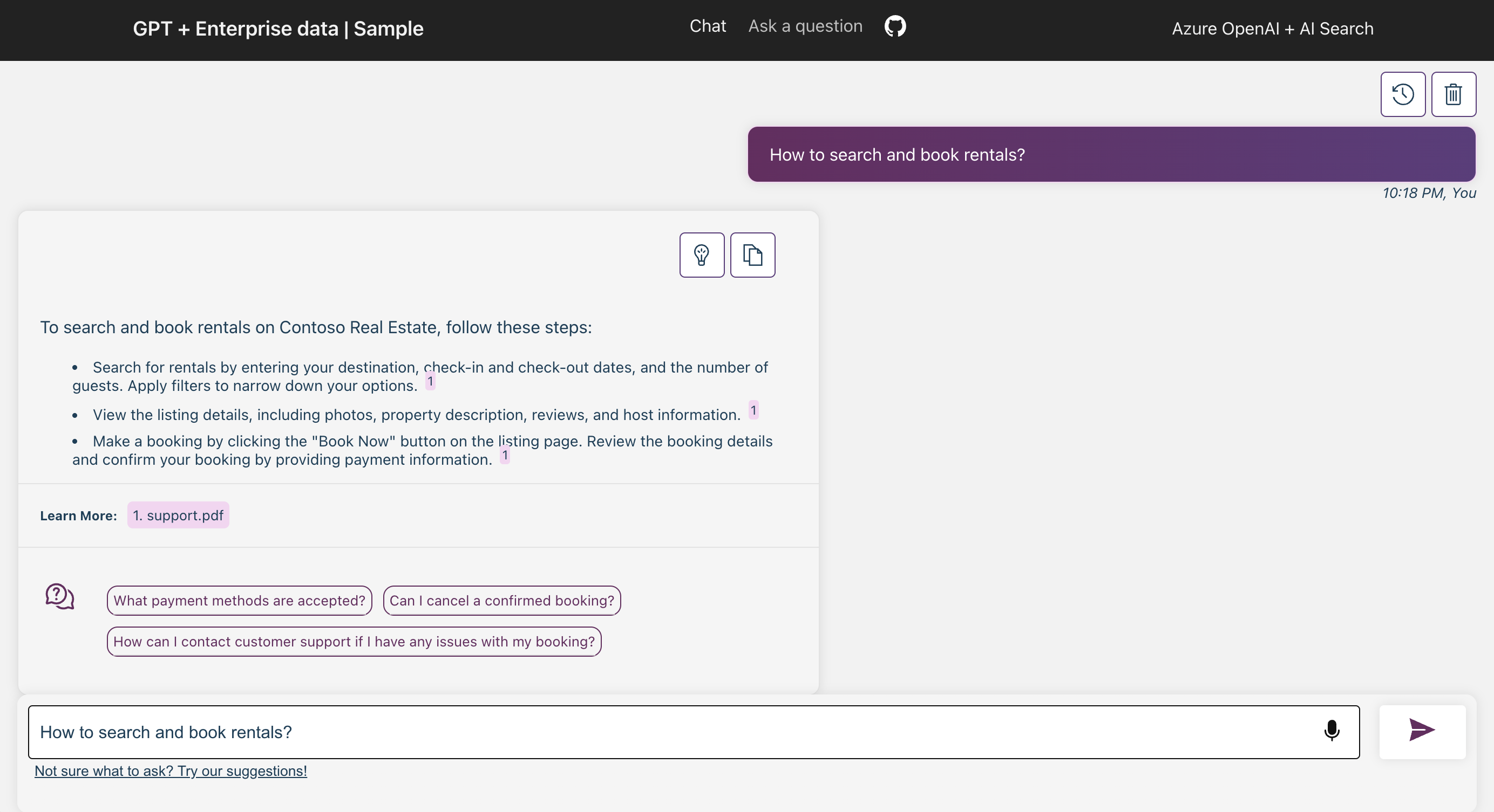 Die Vorlage ist ein serverloser KI-Chatbot mit "Retrieval Augmented Generation" mit LangChain.js und Azure, die eine Reihe von Unternehmensdokumenten verwendet, um Antworten auf Benutzerabfragen zu generieren. Ein fiktives Unternehmen namens Contoso Real Estate wird genutzt, und das Erlebnis ermöglicht es den Kunden, Supportfragen zur Verwendung der Produkte zu stellen. Die Beispieldaten beinhalten eine Reihe von Dokumenten, die die Nutzungsbedingungen, die Datenschutzrichtlinie und einen Supportleitfaden beschreiben.