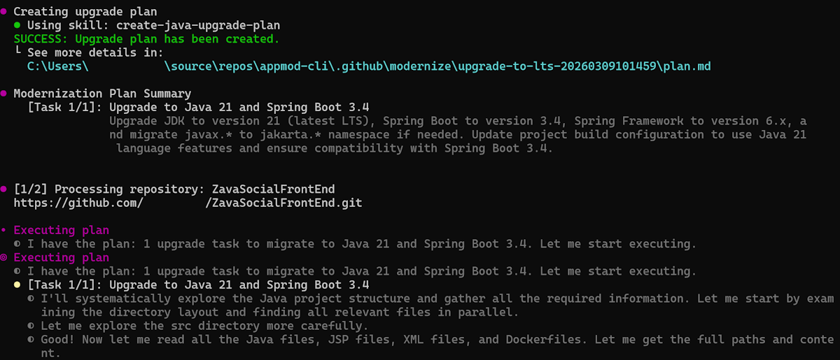 modernize upgrade "Java 21" --source ./repos.json(nicht interaktiv, lokal) -