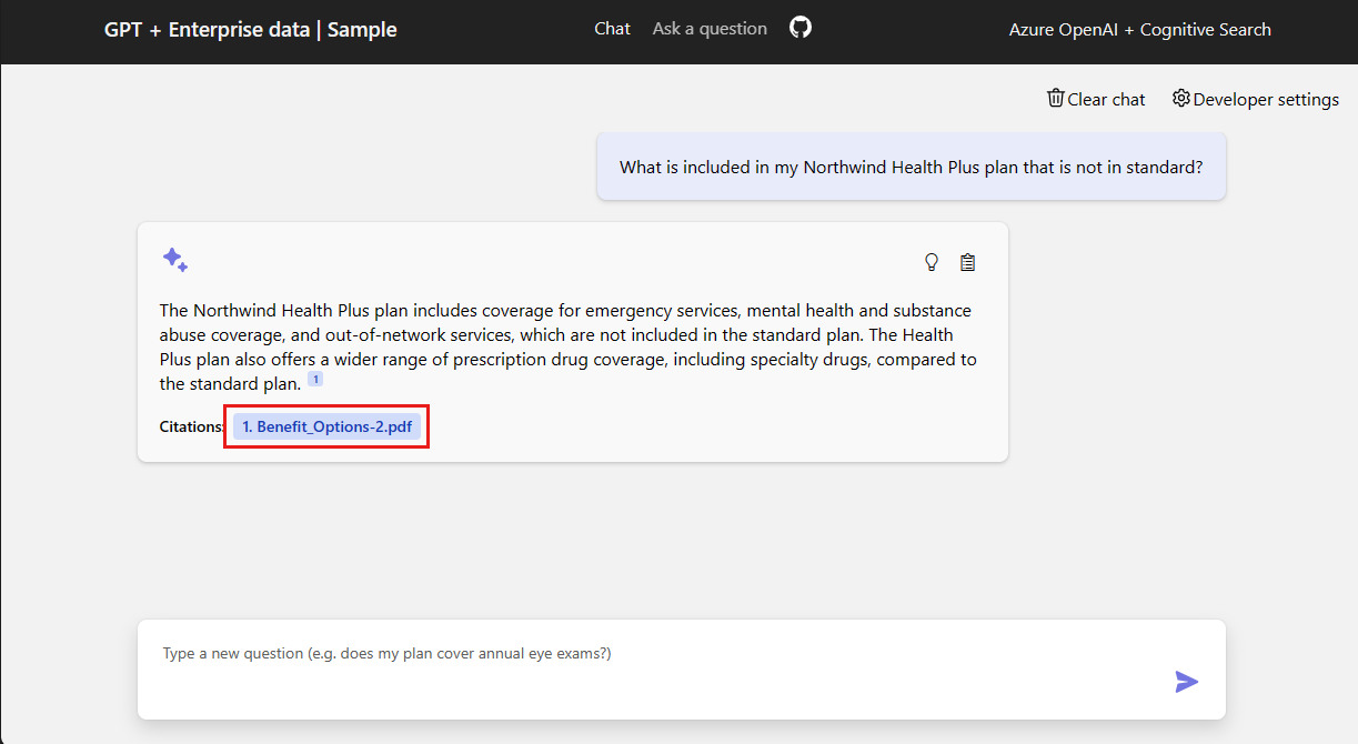 1. Wählen Sie aus oder geben Sie im Browser ein: Was ist in meinem Northwind Health Plus-Plan enthalten, das nicht im Standardplan enthalten ist? im Chat-Textfeld.