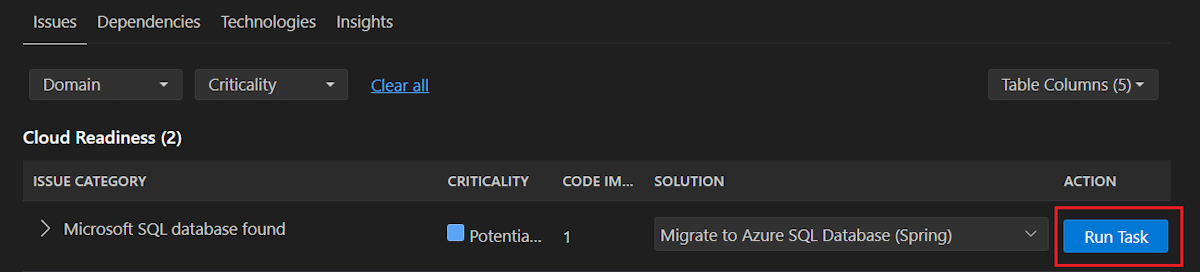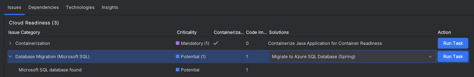 Wenn Sie den Zusammenfassungsbericht überprüfen, können Sie in der Lösungsliste unter der Problemdatenbankmigration (Microsoft SQL) die Option "Zu Azure SQL-Datenbank migrieren" (Spring) auswählen. Wählen Sie dann "Aufgabe ausführen" aus, um zur Codekorrekturstufe zu wechseln.