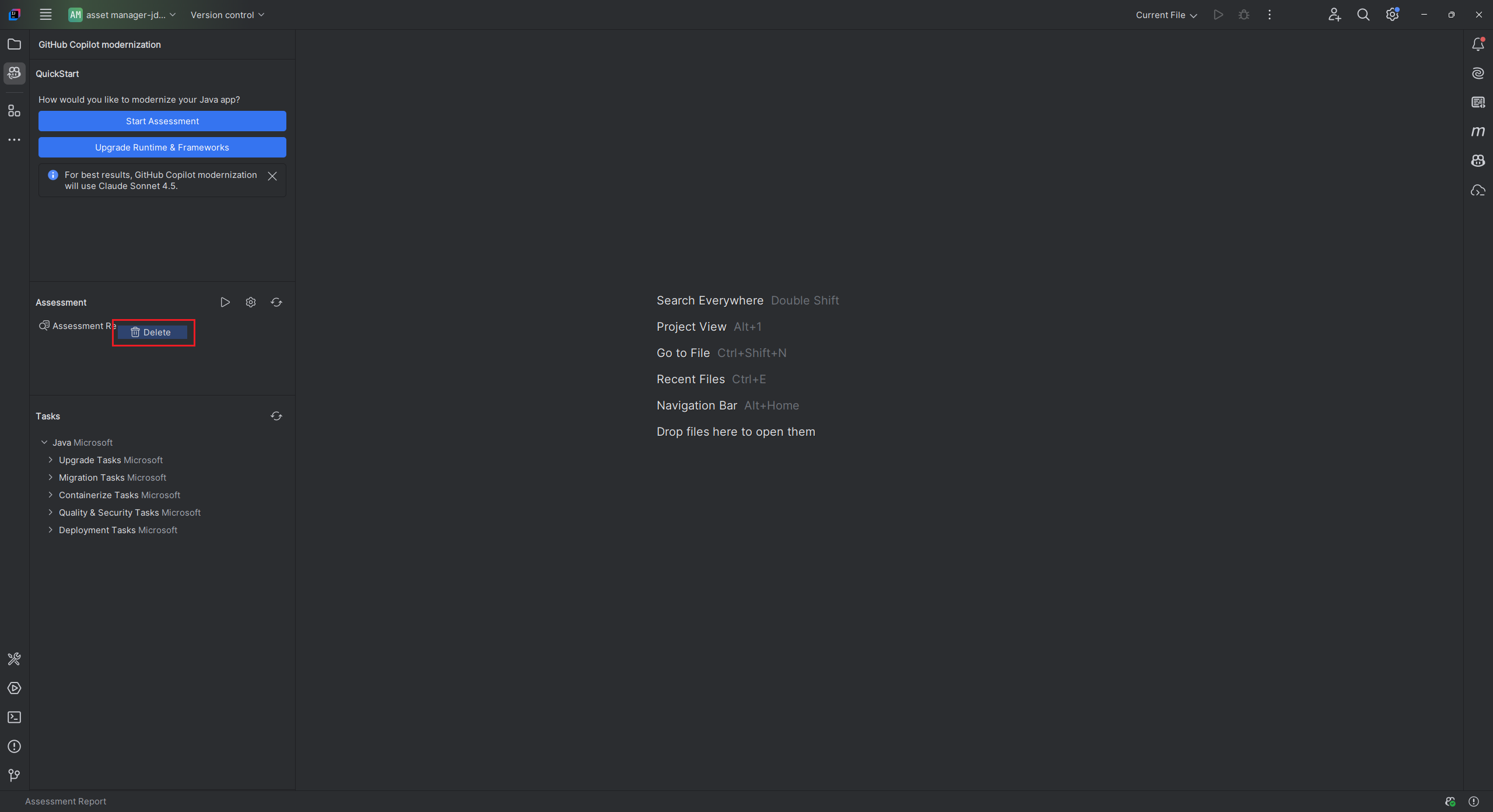 - Wählen Sie im Schnellstartabschnitt des GitHub Copilot-Modernisierungsbereichs "Bewertung starten" oder "Bewertungsdashboard öffnen" aus.