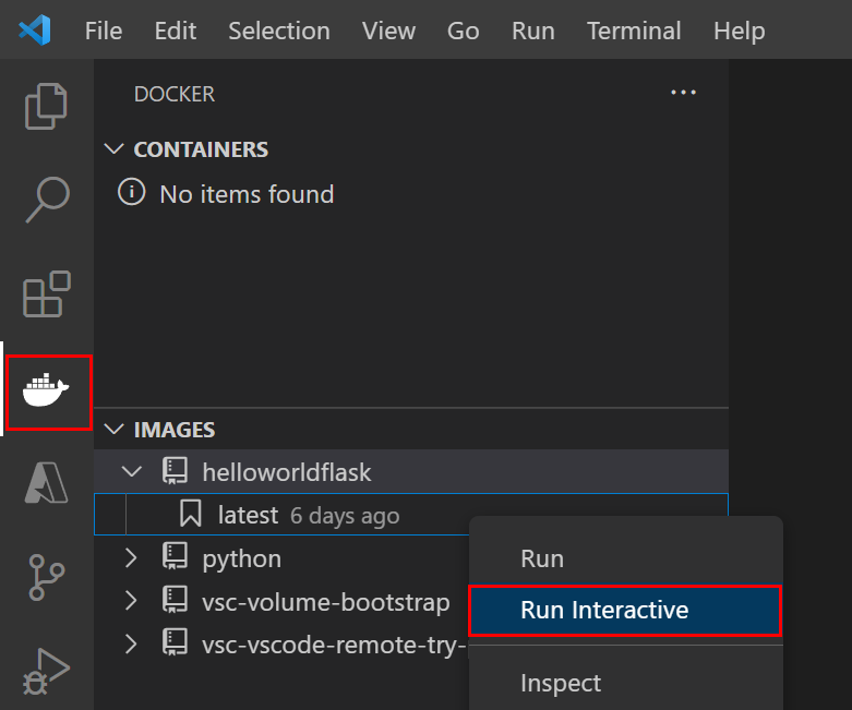| Schritt 3: Wählen Sie das Docker-Symbol in der Erweiterungsleiste aus, erweitern Sie Bilder, und klicken Sie mit der rechten Maustaste auf ein Docker-Image, das als Container ausgeführt wird. |