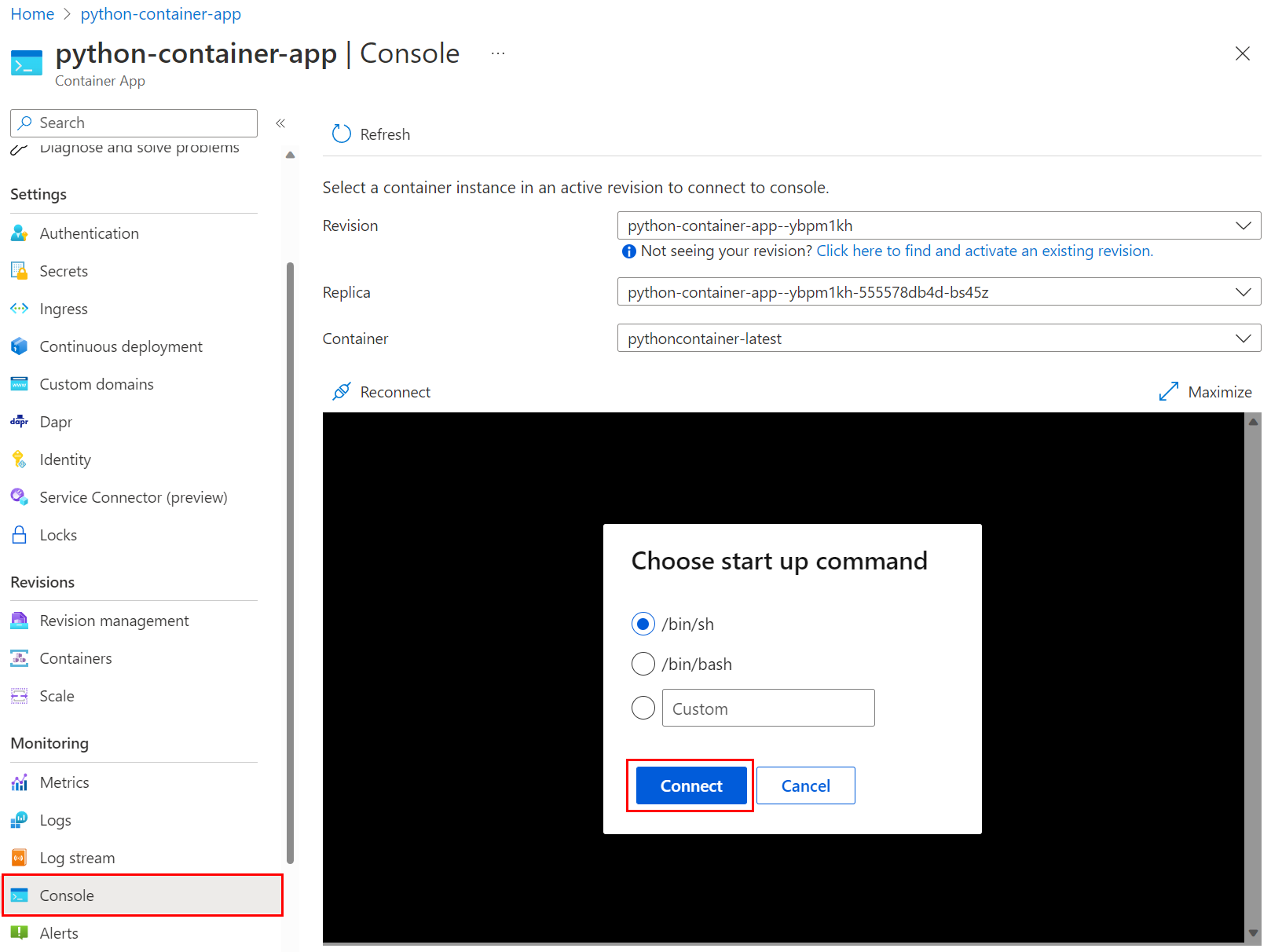 Stellen Sie mit dem Befehl az containerapp exec eine Verbindung her: