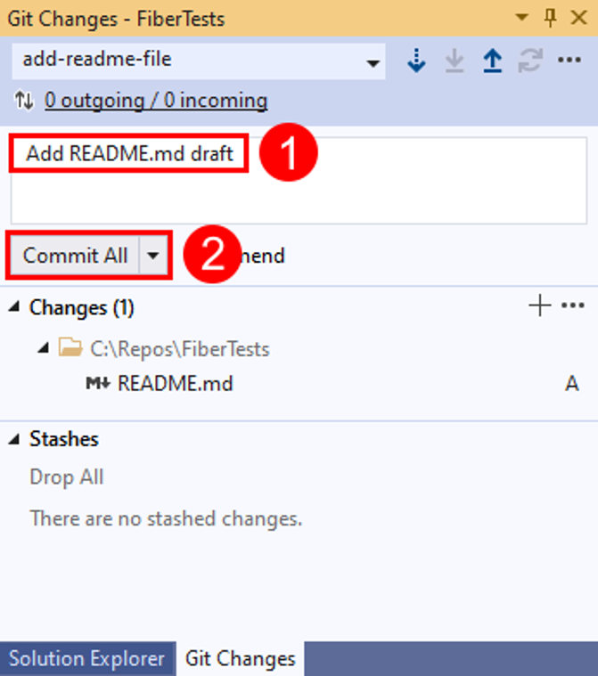 Fügen Sie Ihrem geklonten Repository eine README.md-Datei hinzu. In Projektmappen-Explorer können Sie den Inhalt des Repositorys mithilfe der Ordneransicht durchsuchen oder Visual Studio-Projektmappen im Repository öffnen. Git verfolgt Änderungen nach, die innerhalb ebenso wie außerhalb von Visual Studio vorgenommen wurden.