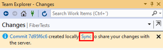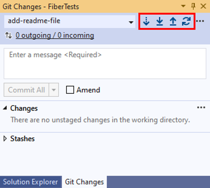 Im Fenster Git-Änderungen können Sie Ihren lokalen Zweig mit seinem Remote-Pendant auf dem neuesten Stand halten, indem Sie die Schaltflächen Abrufen, Holen, Übertragen und Synchronisieren verwenden.