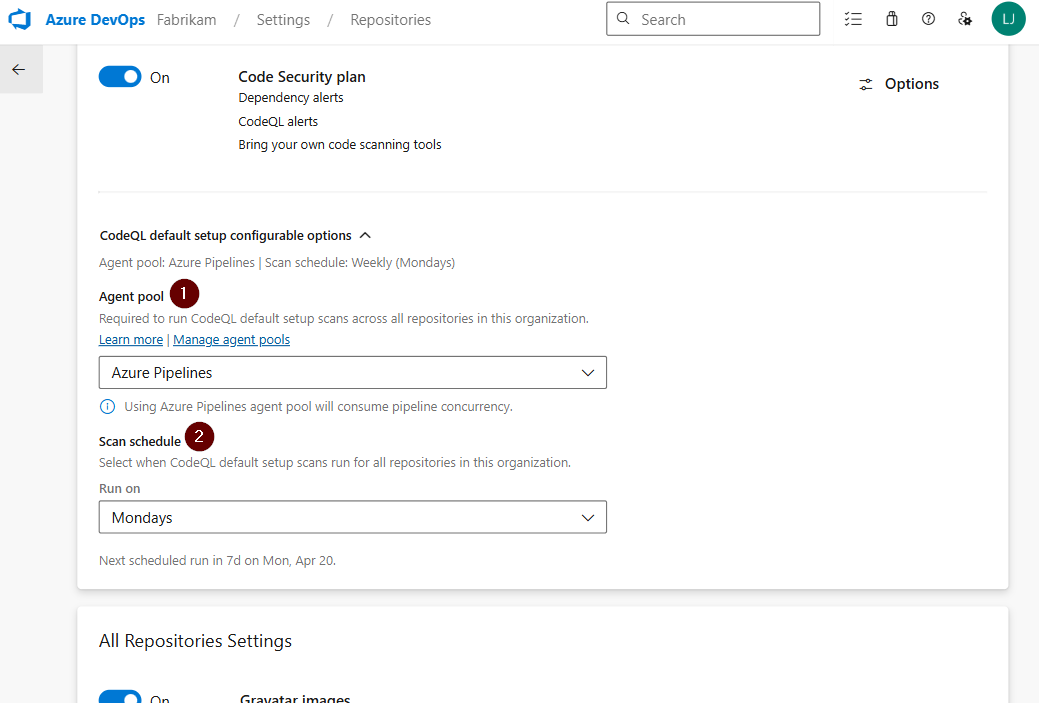 Nachdem Sie codeQL-Standardeinrichtung aktiviert haben, können Sie den Agentpool und den Scanzeitplan aus den Organisationseinstellungen konfigurieren. Diese Optionen gelten für alle Repositorys in der Organisation, die das Standardsetup verwenden.