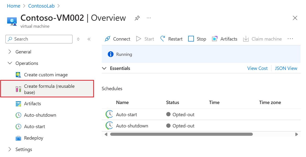 Erweitern Sie auf der Seite Übersicht für die VM den Abschnitt Vorgänge im linken Menü, und wählen Sie Formel erstellen (wiederverwendbare Basis) aus: