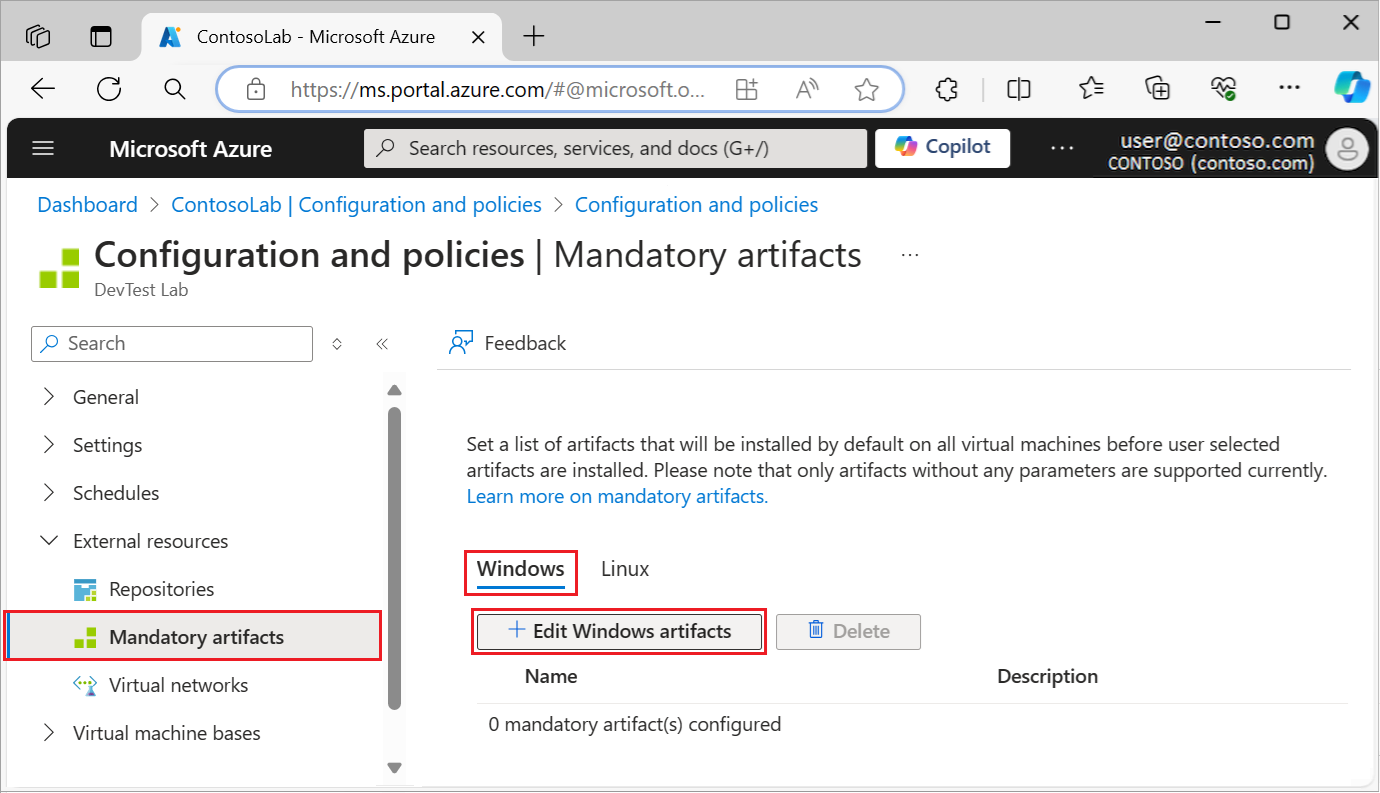 Wechseln Sie im Azure-Portal zu Ihrer DevTest Labs-Labressource, in der Sie die verbindlichen Artefakte definieren möchten.