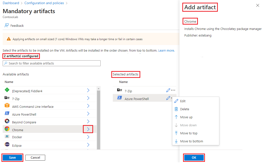 Verbindliche Artefakte dürfen keine konfigurierbaren Parameter aufweisen. Diese Einschränkung erleichtert Labbenutzern das Erstellen von VMs. Verbindliche Artefakte werden immer zuerst auf einer VM installiert, bevor zusätzliche oder benutzerdefinierte Artefakte vom Benutzer ausgewählt werden.