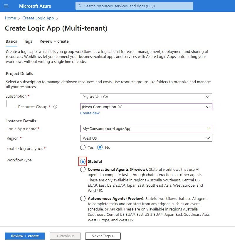In diesem Beispiel wird USA, Westen verwendet.Aktivieren von Log Analytics Ja Nein Ändern Sie diese Option nur, wenn Sie die Diagnoseprotokollierung aktivieren möchten. Behalten Sie für diese Schnellstartanleitung die Standardauswahl bei. Workflowtyp Ja Zustandsbehaftet Der Typ des zu erstellenden Workflows. Alle Consumptions-Workflows sind zustandsbehaftet, was bedeutet, dass der Workflow automatisch Verlaufsinformationen, wie Status, Eingaben und Ausgaben, speichert.