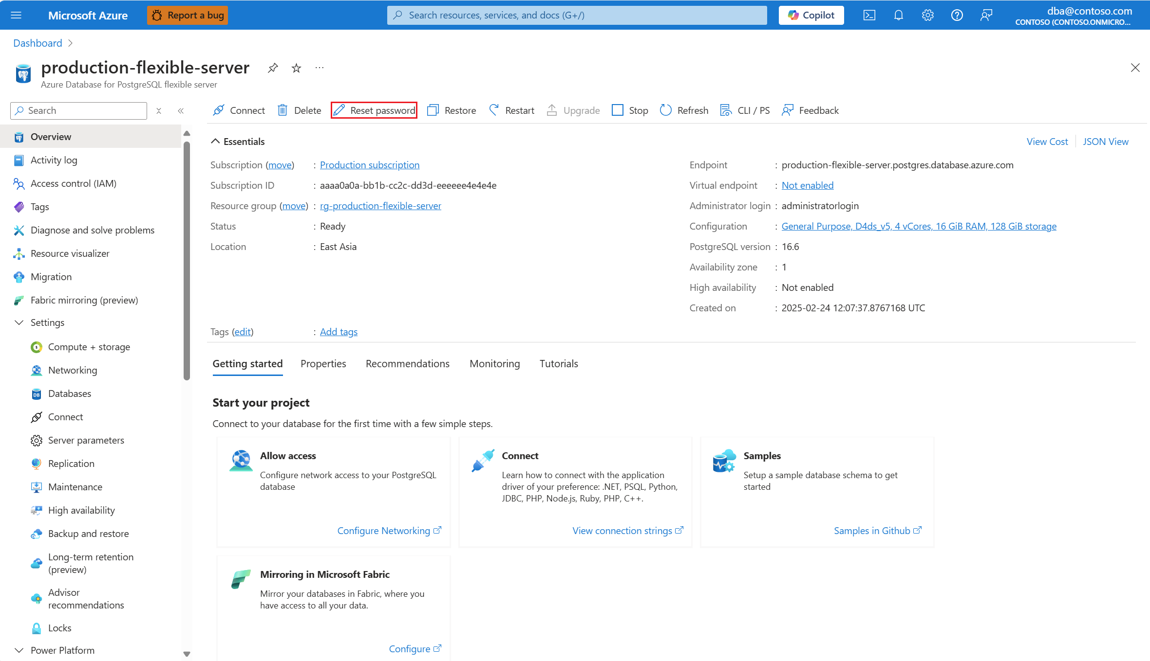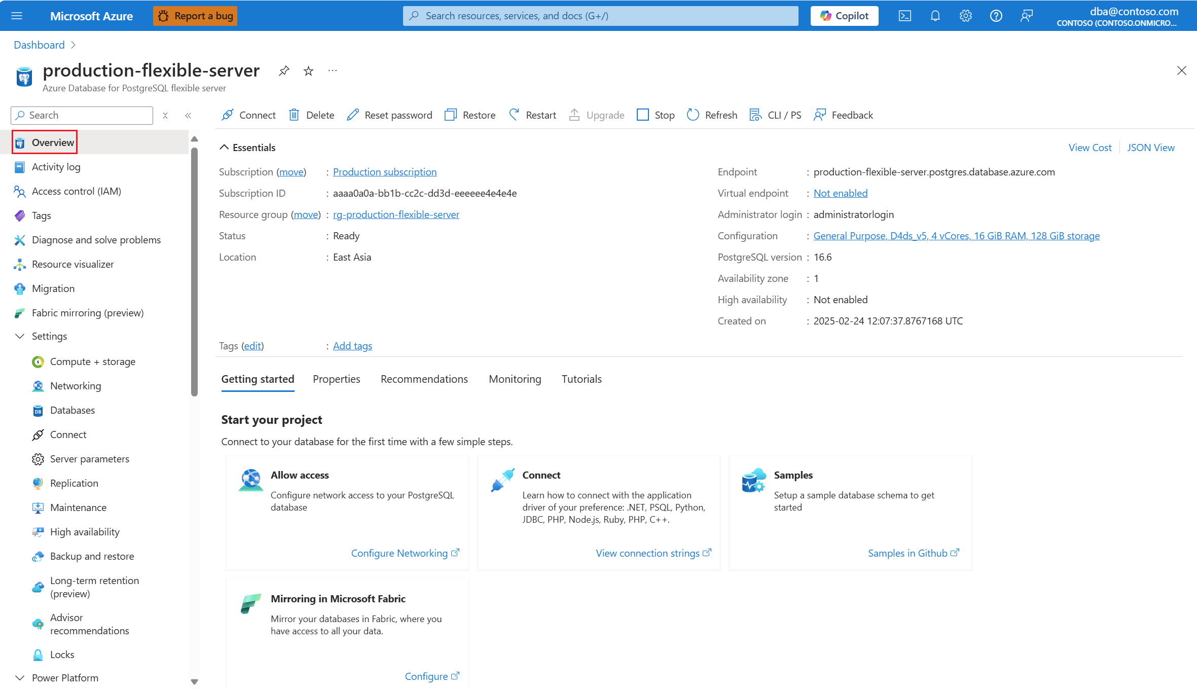 2. Kopieren Sie auf der Seite Übersicht des Servers den vollqualifizierten Servernamen. Der vollqualifizierte Servername hat immer das Format <Servername>.postgres.database.azure.com.