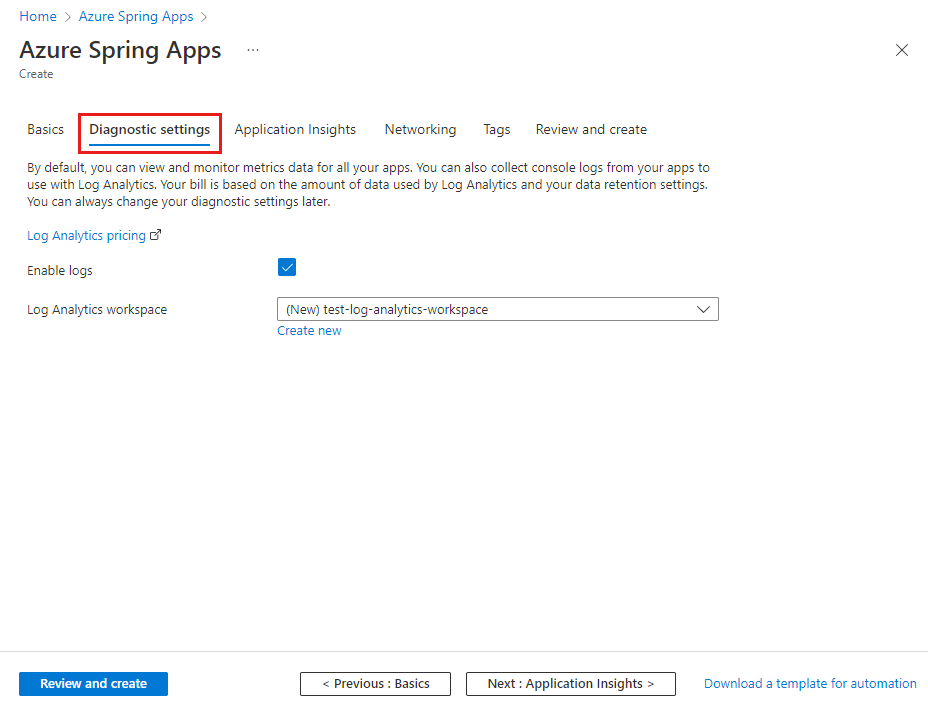 Im Assistenten zum Erstellen einer Azure Spring Apps-Dienstinstanz können Sie das Feld Log Analytics-Arbeitsbereich mit einem vorhandenen Arbeitsbereich konfigurieren oder einen Arbeitsbereich erstellen.