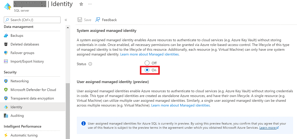 2. Wechseln Sie zu Ihrem logischen Azure SQL-Server, wählen Sie Identität aus, und legen Sie dann Systemseitig zugewiesene verwaltete Identität auf Ein fest.