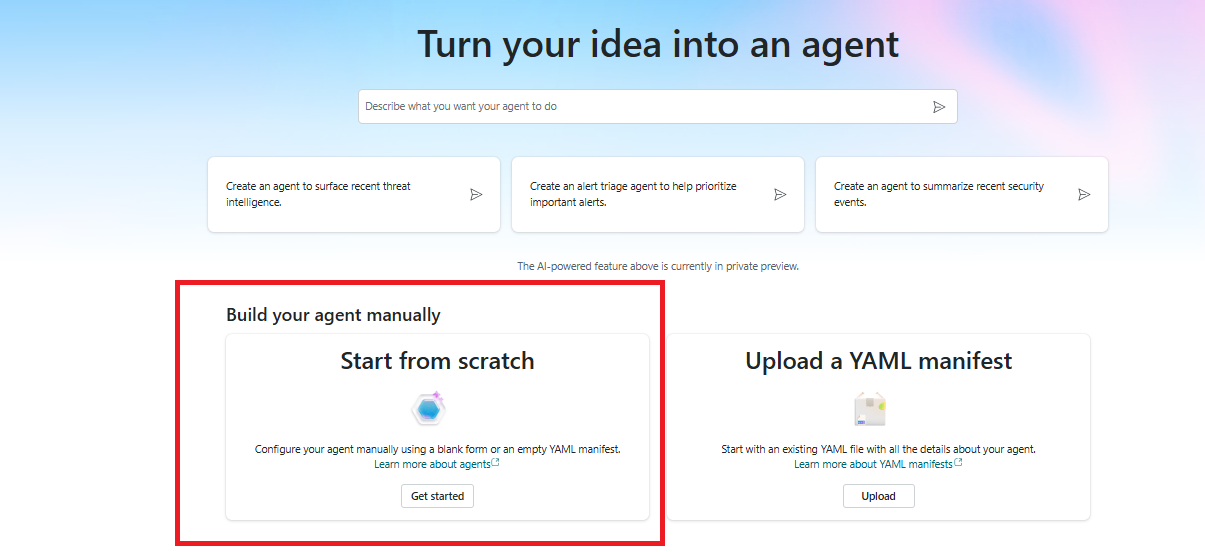Navigieren Sie zum Menü Erstellen in Security Copilot.