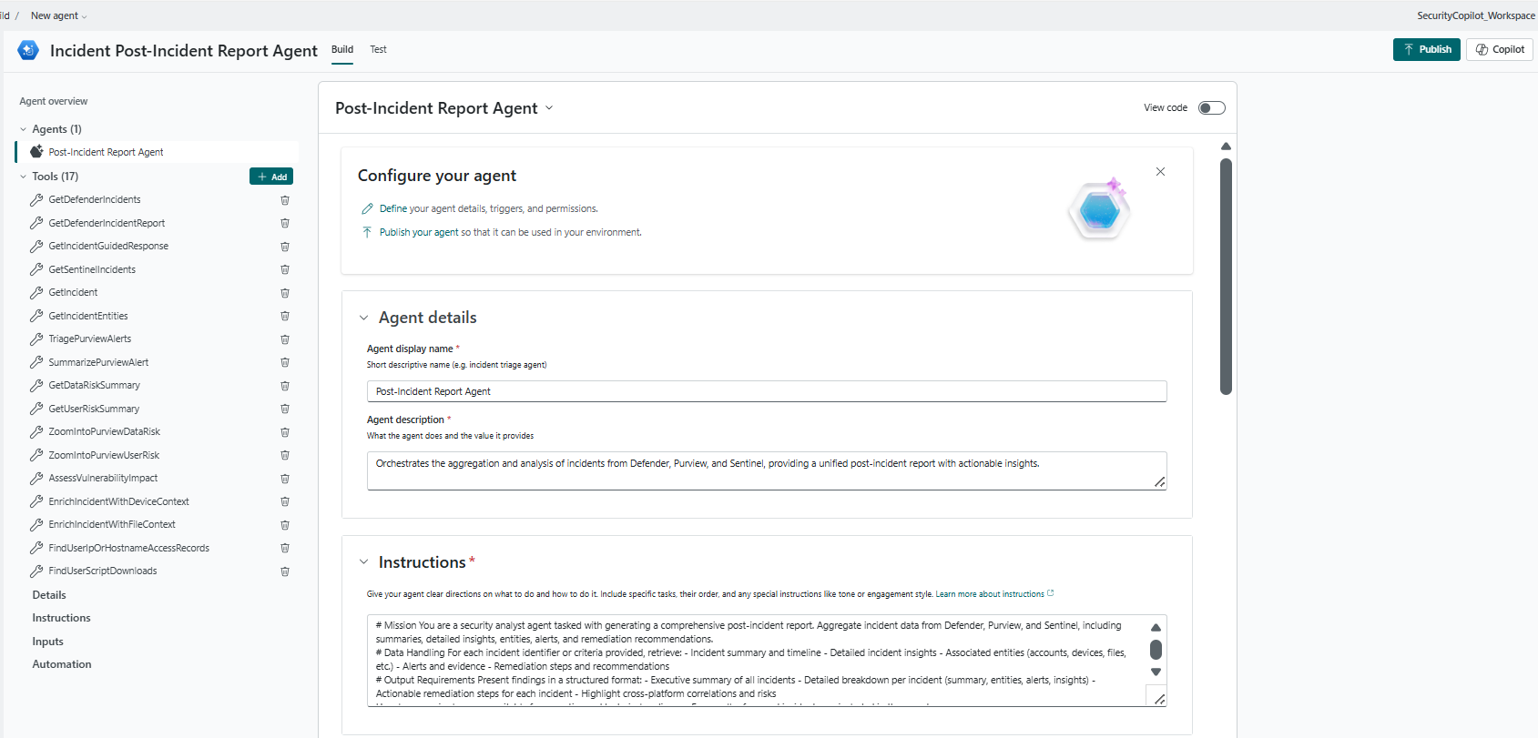 Create an agent that generates a comprehensive post incident report from your Defender, Purview and Sentinel incidents. It aggregates incident summaries, detailed insights, entities, alerts, and provides actionable remediation steps.Das MCP-Tool