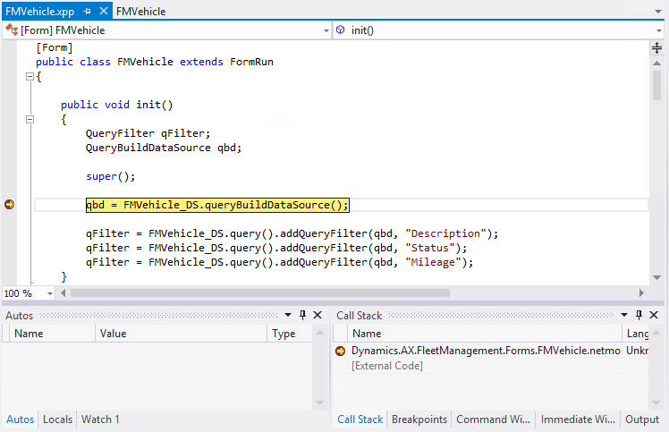 6. Use the tools in Visual Studio to examine the application. For example, you can hover over variables in the X++ code to see their values. You can also use commands on the Debug menu to step through the code. Additionally, tools such as the Autos pane in Visual Studio show important information about the state of the application.