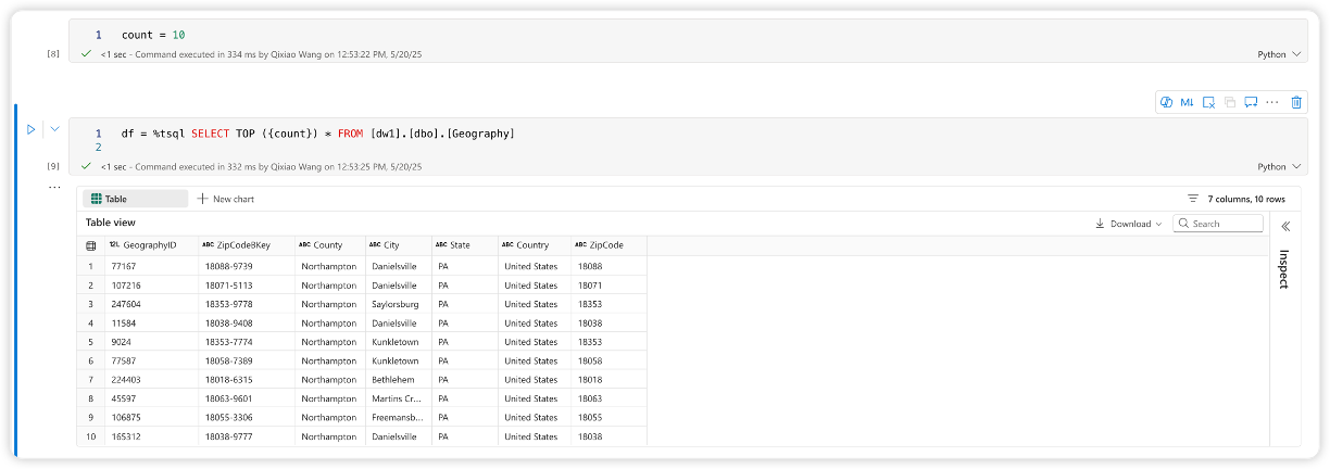 %tsqlin den folgenden Zellen verwenden. Die Funktion „Line Magic“ wird die in Schritt 1 hergestellte Verbindung verwenden, ohne dass Sie-artifactund-typeerneut angeben müssen. Beispiel:df = %tsql SELECT TOP(10) * FROM [ContosoDWH].[dbo].[Geography];