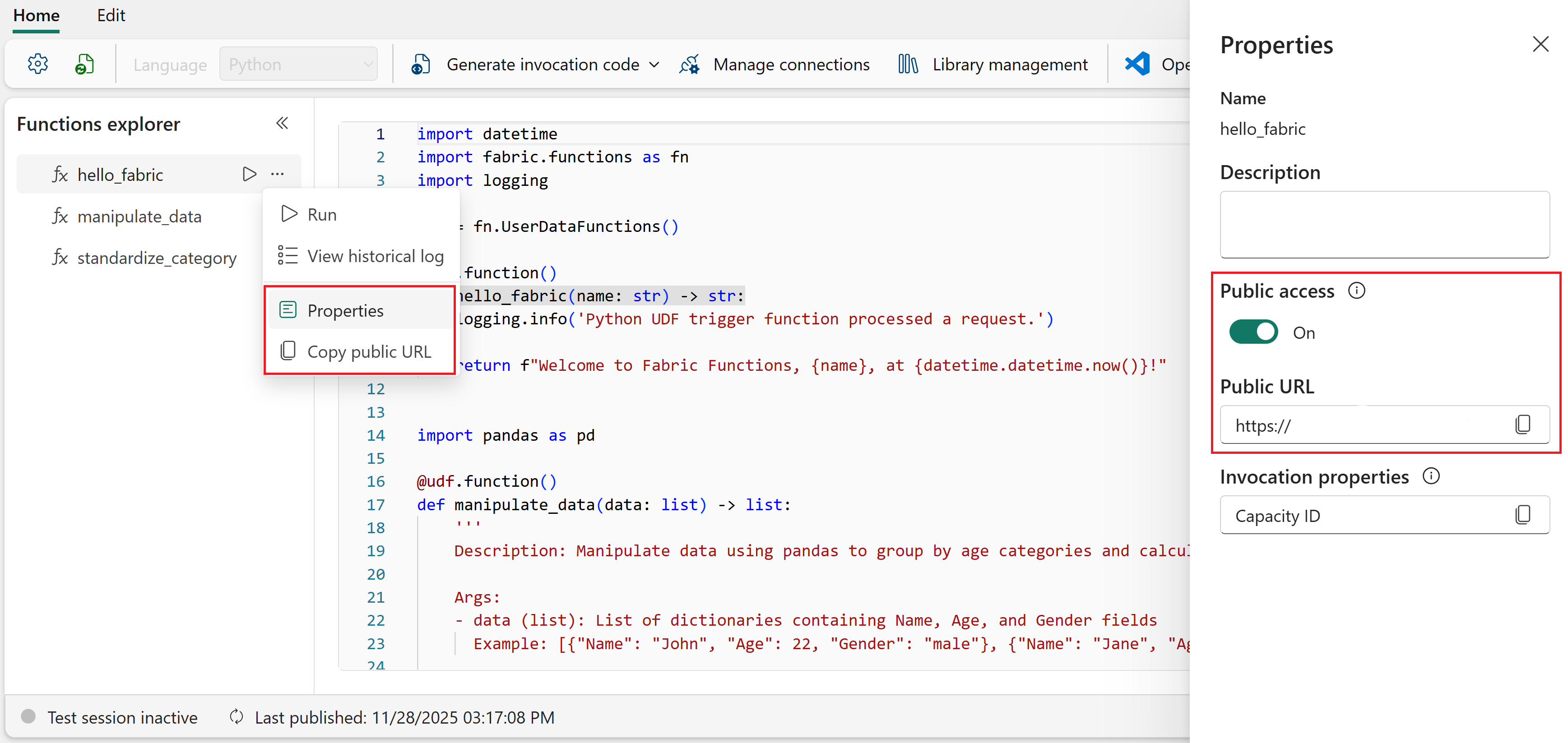 Sie können Fabric-Benutzerdatenfunktionen aus externen Anwendungen aufrufen, indem Sie HTTP-Anforderungen an den öffentlichen Endpunkt der Funktion senden. Auf diese Weise können Sie Ihre Fabric-Geschäftslogik in Web-Apps, Automatisierungsskripts, Microservices oder ein beliebiges System außerhalb der Fabric-Umgebung integrieren.