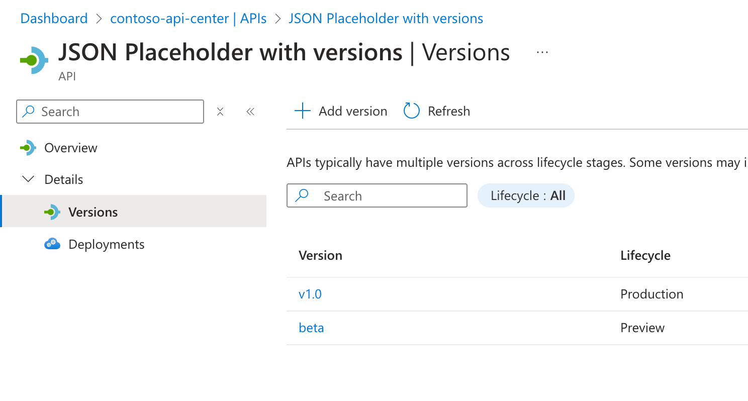 Erstellen Sie zunächst eine Azure API Center-Instanz, und registrieren Sie APIs, die Sie in Ihrer Organisation verwenden. Definieren Sie für jede API die verwendeten Versionen, und geben Sie deren Lebenszyklusphase an.