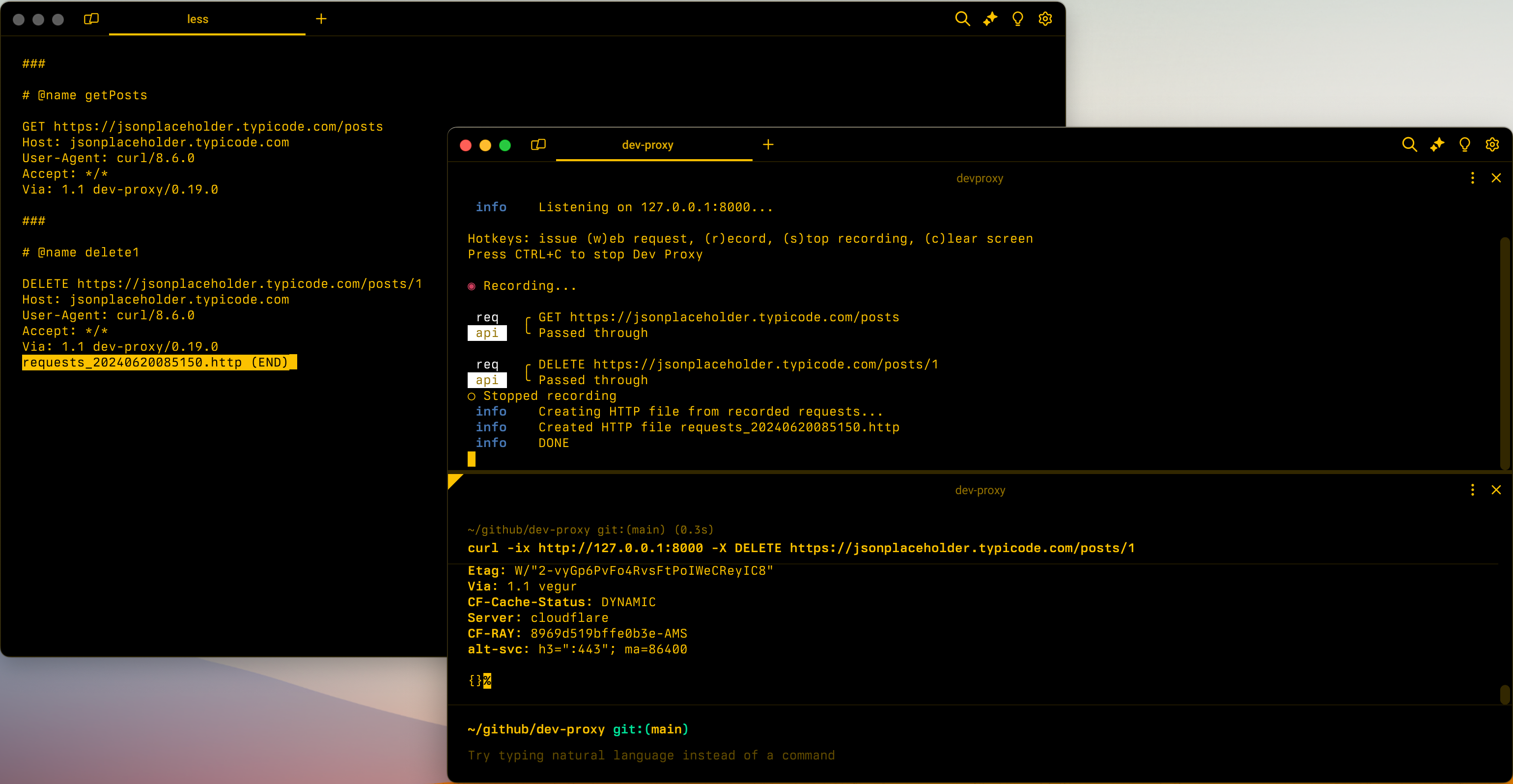 Mit Dev Proxy können Sie eine HTTP-Datei aus abgefangenen API-Anforderungen und -Antworten generieren. Die Verwendung von HTTP-Dateien ist besonders nützlich für Entwickler, die DAS API-Verhalten simulieren oder reproduzierbare API-Interaktionen teilen möchten. Die HTTP-Datei enthält alle relevanten Anforderungs- und Antwortdetails, wobei vertrauliche Informationen durch Variablen zur Sicherheit und Wiederverwendbarkeit ersetzt werden.
