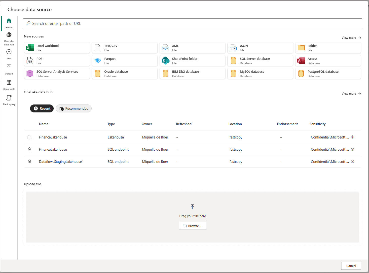 Wählen Sie auf der Seite " Datenquelle auswählen" die Datenquelle aus, in der die Tabellen gespeichert sind. Mit der Auswahl der angezeigten Datenquellen können Sie Datenflusstabellen erstellen.