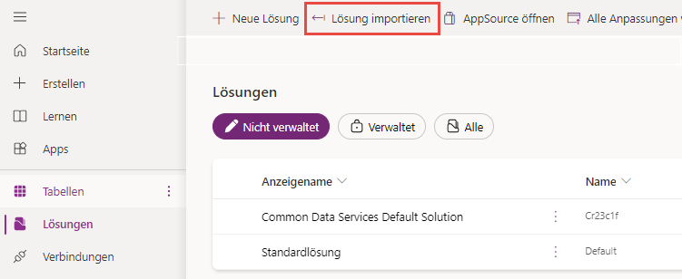 Wählen Sie Lösungen aus, und klicken Sie dann auf die Schaltfläche Lösung importieren.