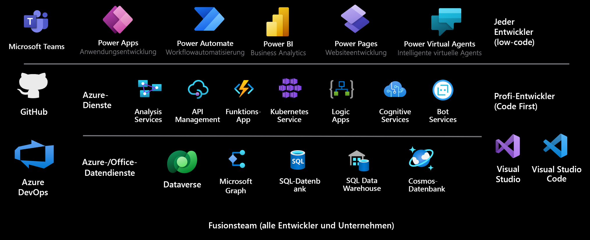 Die Plattform verwendet einen Ansatz, der nur wenig Code erfordert, um schnell Lösungen zu erstellen. Sie ermöglicht jedem in einem Unternehmen, vom Außendienstmitarbeiter bis zum professionellen Entwickler, an der Erstellung von Apps mitzuwirken, die für positive Geschäftsergebnisse sorgen. Entwickler können nahtlos mit den Entwicklern eines Unternehmens zusammenarbeiten, um Lücken zu schließen und komplexe Herausforderungen mithilfe eines umfassenden von der Plattform bereitgestellten Erweiterungsmodells zu lösen. Mithilfe der nativen Integration in Azure können Entwickler für die Erweiterung der Microsoft Power Platform auch ihre Cloud-Entwicklungsfähigkeiten nutzen. Dieser Low-Code-Entwicklungsansatz ist eine transformative Methode, um Anwendungsentwicklungsziele innerhalb einer Organisation schnell zu erreichen.