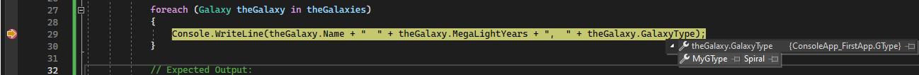 theGalaxy.GalaxyType, und ändern Sie den Wert intheGalaxy.GalaxyType.MyGType. Obwohl Sie die Änderung vornehmen können, zeigt der Code-Editor einen Fehler an (rote Schlangenlinie). (In Visual Basic wird der Fehler nicht angezeigt, und dieser Codeabschnitt funktioniert.)Drücken Sie F11 (Debuggen>Schritt in oder die Schaltfläche Schritt in auf der Symbolleiste "Debuggen") aus, um die aktuelle Codezeile auszuführen.