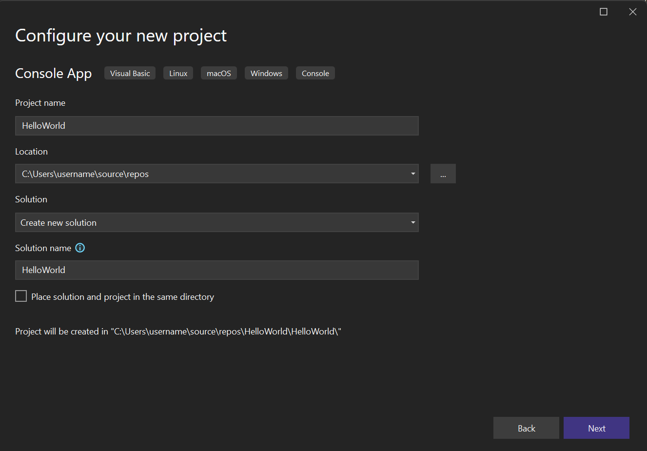 Geben Sie im Fenster Neues Projekt konfigurieren den Text HelloWorld als Projektname ein. Ändern Sie optional den Speicherort des Projektverzeichnisses vom Standardspeicherort C:\Users\name\source\repos, und klicken Sie dann auf Weiter.