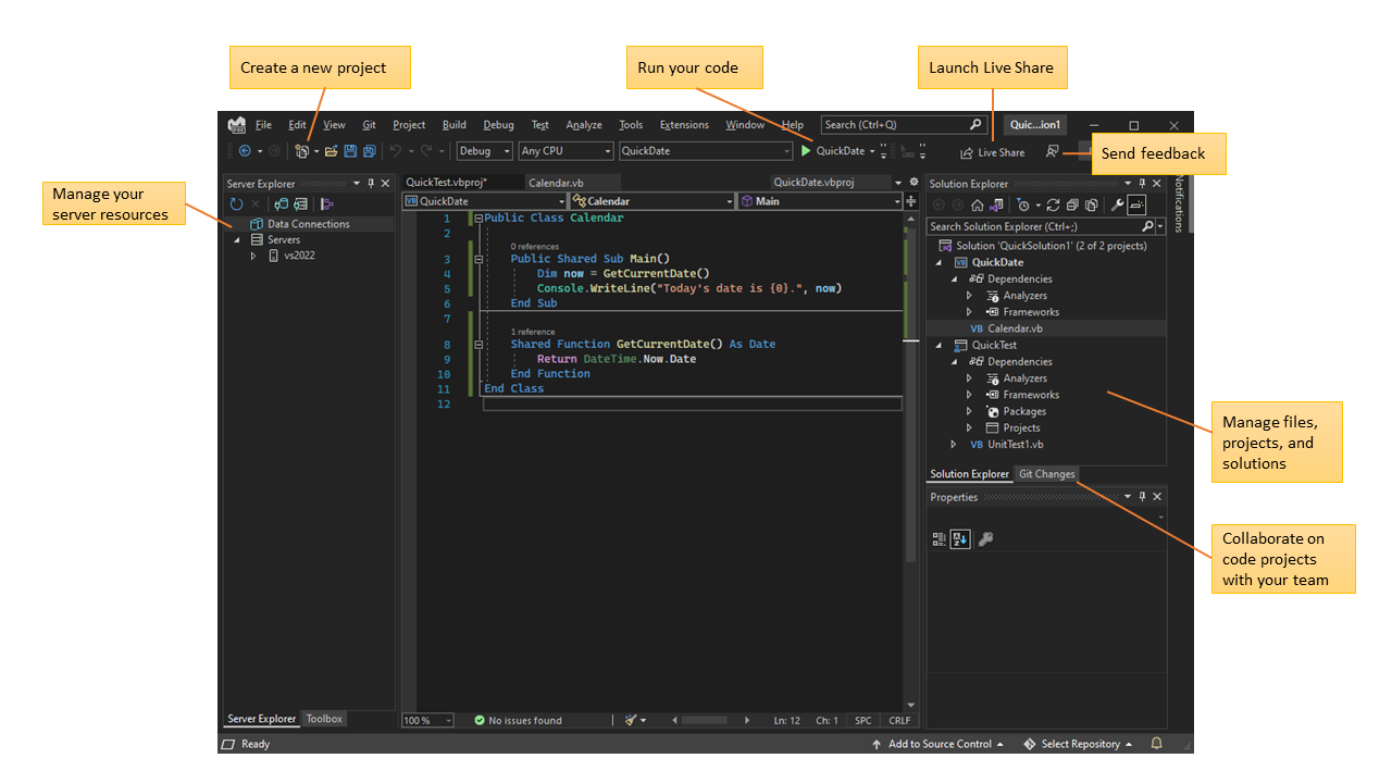 Die obige Abbildung zeigt Visual Studio mit einem geöffneten Visual Basic Projekt, das wichtige Fenster und deren Funktionalität anzeigt: