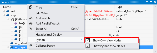Um das Feature zu aktivieren, klicken Sie mit der rechten Maustaste in das Fenster "Locals ", und legen Sie die Menüoption "Python>Show C++-Ansichtsknoten" fest.