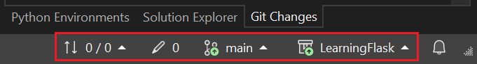 Von links nach rechts zeigt die Git-Kontrollleiste die Anzahl der ausgehenden/eingehenden Übertragungen (Pfeile #/#), die Anzahl der nicht übertragenen Änderungen (Bleistift #), den aktuellen Zweignamen und den aktuellen Repository-Namen an. Git-Steuerelemente sind auch im Git-Menü auf der Hauptsymbolleiste verfügbar.