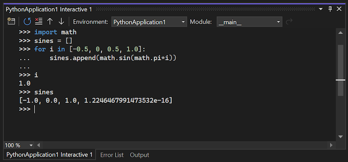 Visual Studio bietet außerdem eine enge Integration zwischen dem Python-Code-Editor und dem Interactive-Fenster. Mit der Tastenkombination STRG+EINGABE wird die aktuelle Codezeile (oder der Codeblock) im Editor bequem an das interaktive Fenster gesendet und dann wird zur nächsten Zeile (oder zum nächsten Block) gewechselt. mit STRG+Eingabe können Sie Code ganz einfach durchlaufen, ohne den Debugger ausführen zu müssen. Sie können auch ausgewählten Code an das fenster Interactive mit demselben Tastenanschlag senden und Code aus dem Fenster Interactive in den Editor einfügen. Zusammen können Sie mit diesen Funktionen Details für ein Codesegment im fenster Interaktive herausarbeiten und die Ergebnisse einfach in einer Datei im Editor speichern.