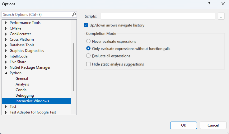 Sie können verschiedene Aspekte des interaktiven Fensterssteuern, z. B. den Speicherort von Startskriptdateien und die Funktionsweise der Pfeiltasten in der Fensterumgebung. Um auf die Optionen zuzugreifen, wählen Sie Tools>Optionen>Python>Interactive Windowsaus: