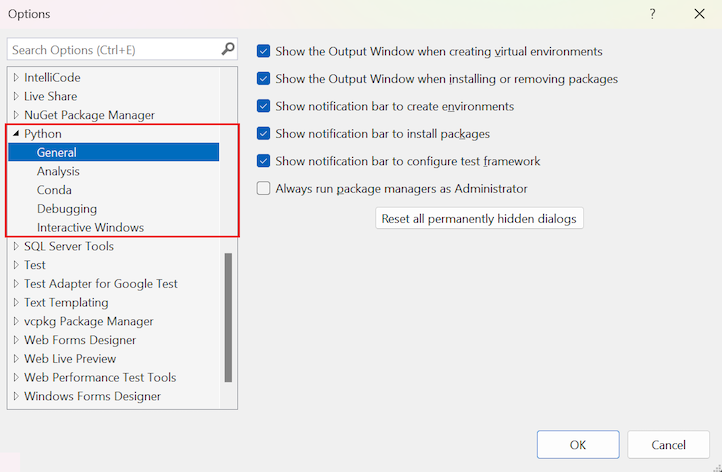 Das Dialogfeld "Optionen " enthält möglicherweise eine Registerkarte " Experimental " oder eine Gruppe für Features in der Entwicklung, die in diesem Artikel nicht beschrieben werden. Weitere Informationen finden Sie in Beiträgen zum Python-Engineering im Microsoft-Blog.