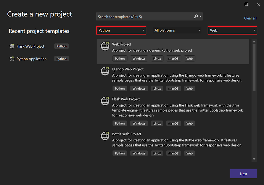 Sie erstellen ein Projekt aus einer Vorlage, indem Sie im Symbolleistenmenü "Neues>Projekt>" auswählen. Im Dialogfeld " Neues Projekt erstellen" können Sie die Liste der Vorlagen filtern, um die für Python-Webprojekte verfügbaren Optionen anzuzeigen. Geben Sie schlüsselbegriffe in das Suchfeld ein, oder verwenden Sie die Filterdropdownmenüs, um Python als Sprache und Web als Projekttyp auszuwählen.