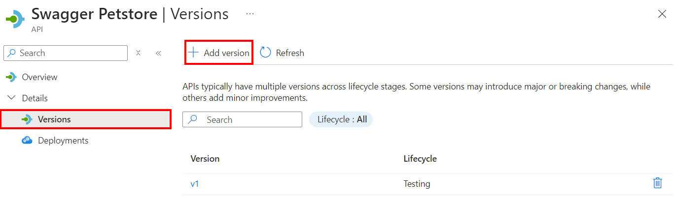 On the API page, under Details, select Versions > + Add version.