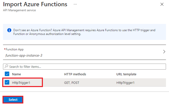 Select the functions that you want to import and click Select. You can only import functions that have an HTTP trigger and an Anonymous or Function authorization level.