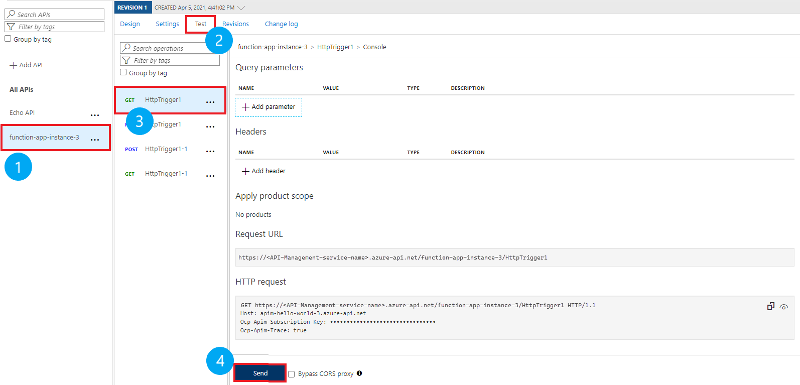Ocp-Apim-Subscription-Key. This header is for the product subscription key that's associated with the API. - If you created the API Management instance, you're an administrator, so the key is filled in automatically.
