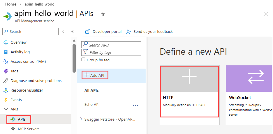 In the sidebar menu, select APIs > APIs, and then select + Add API. Choose the HTTP tile: