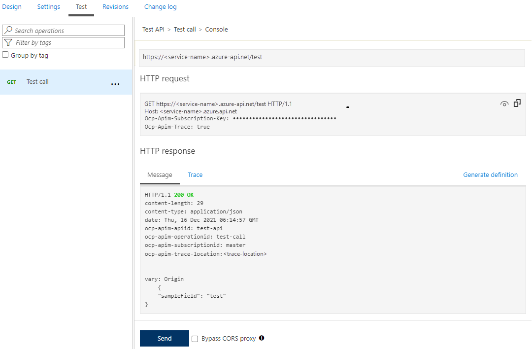 On the Test tab, ensure that the Test call API is selected, and then select Send to make a test call: