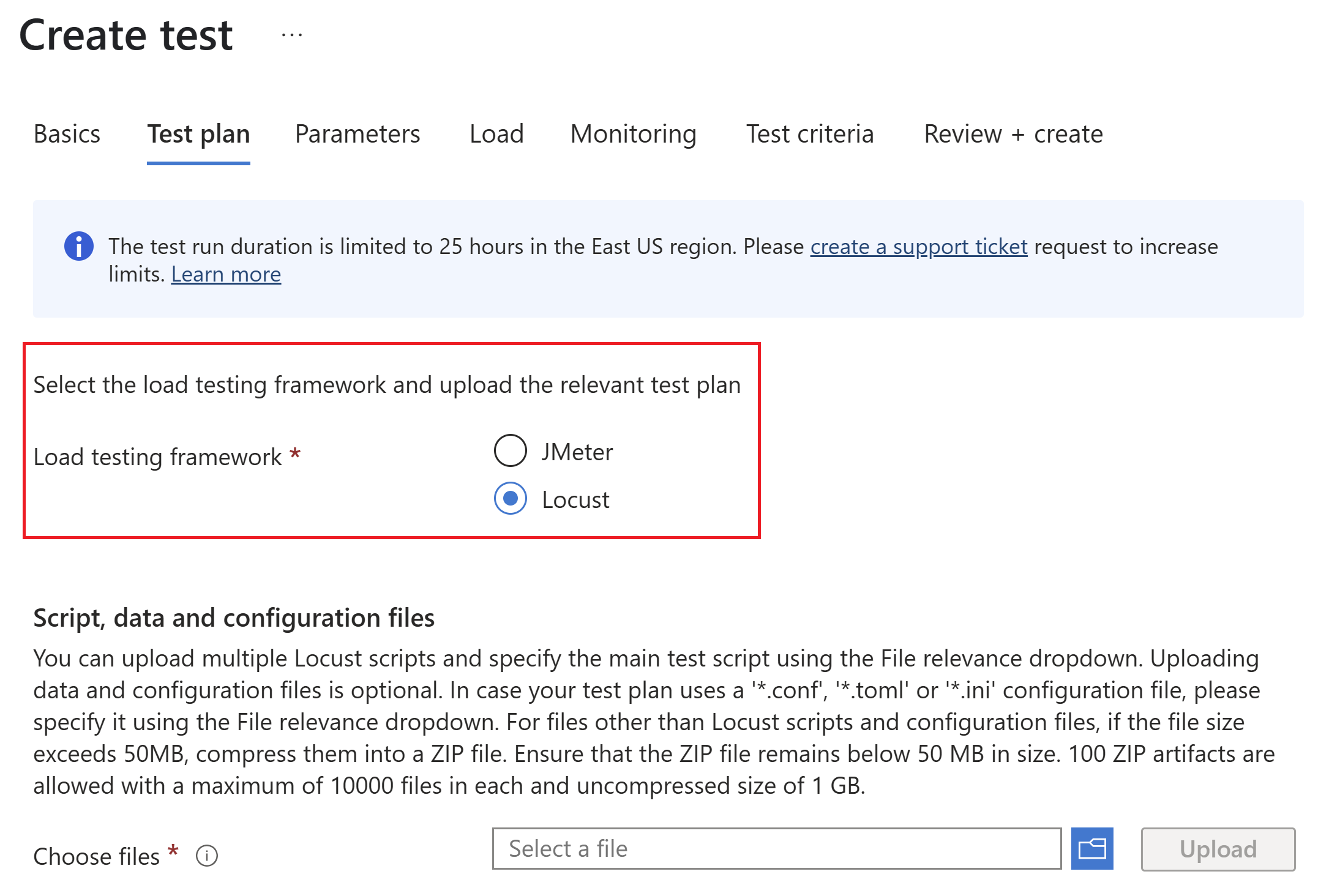 5. On the Test plan tab, select Locust as the Load testing framework.
